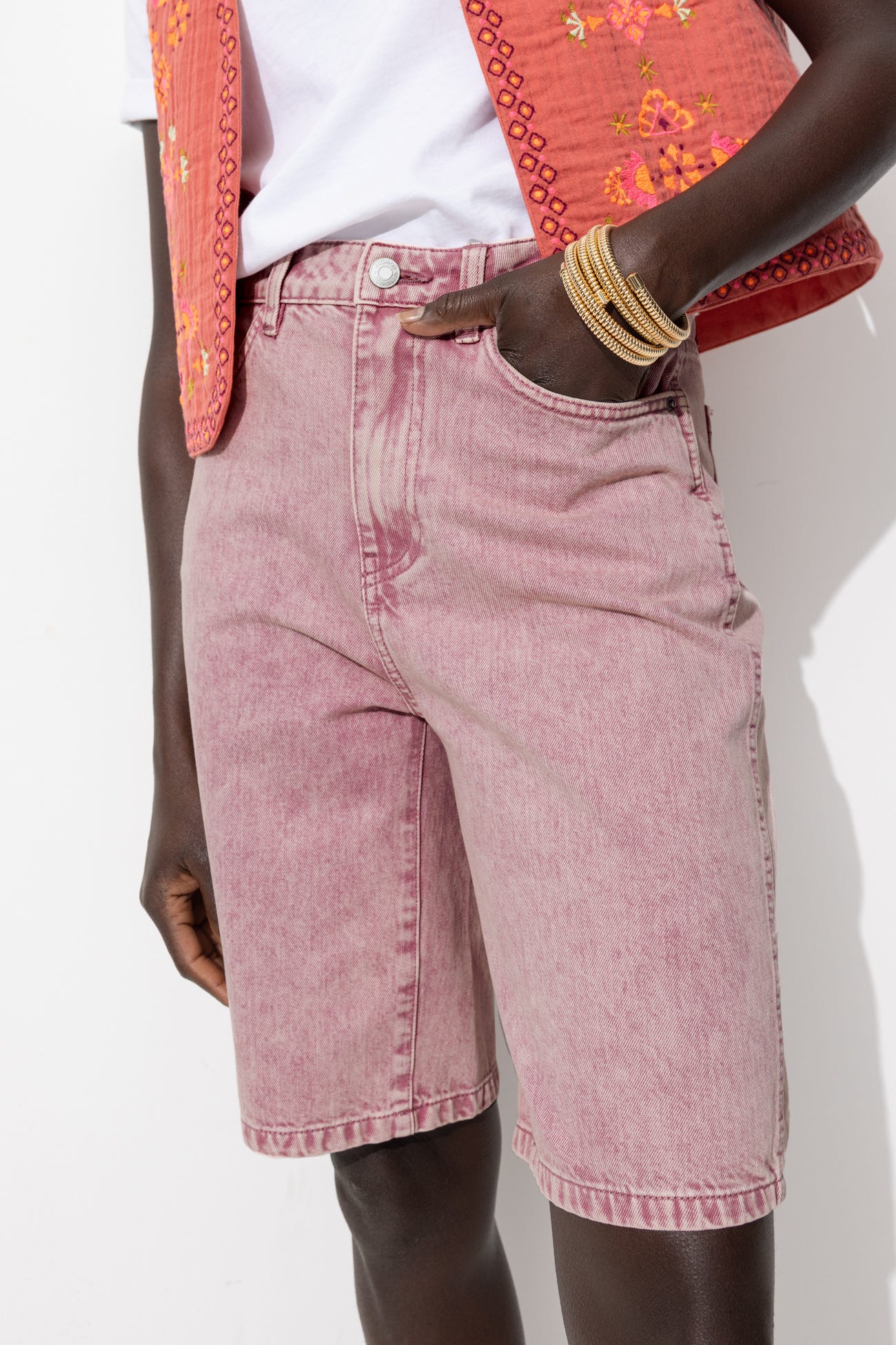 Cette saison, le bermuda s’installe en ville ! On l'upgrade avec une chemise, des bijoux classy, un sac en cuir pour lui faire oublier son côté rando. On l'emmène en vacances pour des expéditions stylées ! Denim 100% coton. Taille haute. Passants. Ouverture par bouton clou et zip métal. 5 poches. Rivets métal. Finition surpiquée. Ce short long femme contient du coton recyclé.