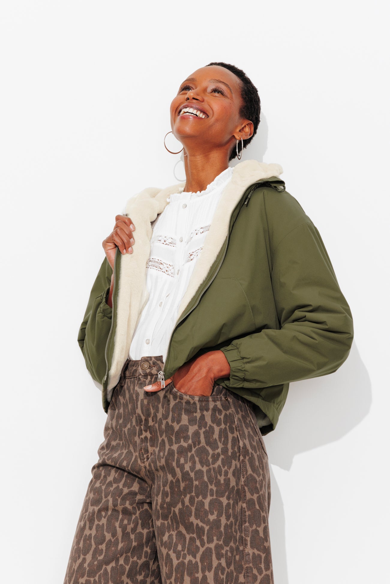 Pour parcourir la ville à pieds ou à vélo. Pour découvrir le monde seule ou accompagnée. On opte pour ce blouson doublé entièrement en fausse fourrure super douce : c'est un doudou à emmener partout ! Coupe courte. Capuche avec liens coulissants. Ouverture zippée devant. Manches longues, poignets élastiqués. 2 poches devant. Base droite. Ce manteau court femme contient des fibres recyclées.