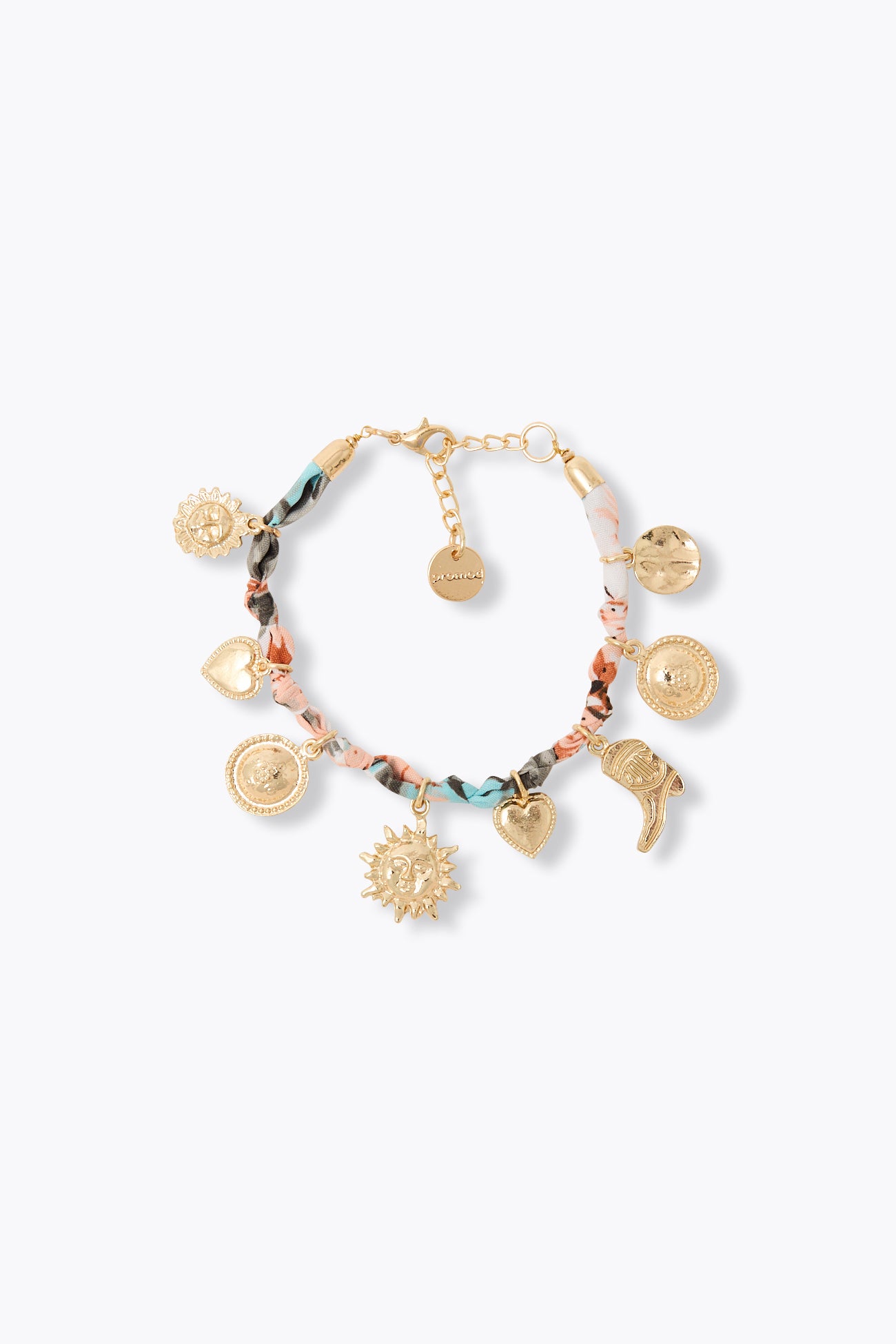 Des charm's sur un ruban imprimé s'animent à nos poignets : petit crush absolu pour ce nouveau bracelet fantaisie ! A aimer en duo avec une robe unie, un t-shirt à message, un top à bretelles. Taille unique. Longueur ajustable, fermoir et chaînette métal. Belle idée-cadeau.