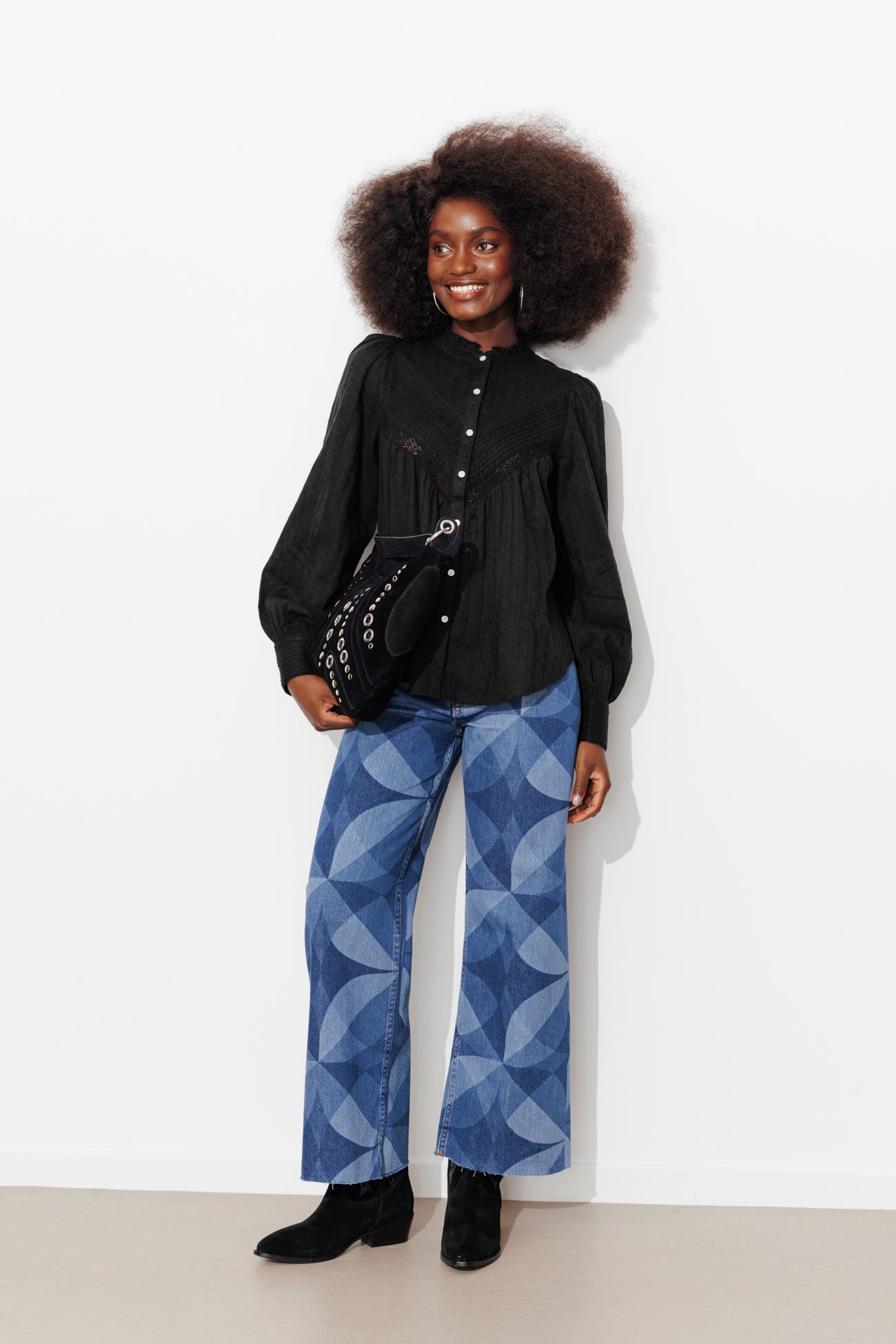 Mood rétro. Ambiance romance. Ce chemisier est une petite merveille. Focus sur les jolis détails : motifs façonnés, boutons nacrés, frou-frou, plis religieuse et galon de dentelle. Coupe droite. Col rond. Ouverture boutonnée. Manches longues bouffantes. Poignets boutonnés. Base arrondie. Contient du coton issu de l'agriculture biologique, cultivé sans pesticides, ni engrais chimiques, ni OGM.