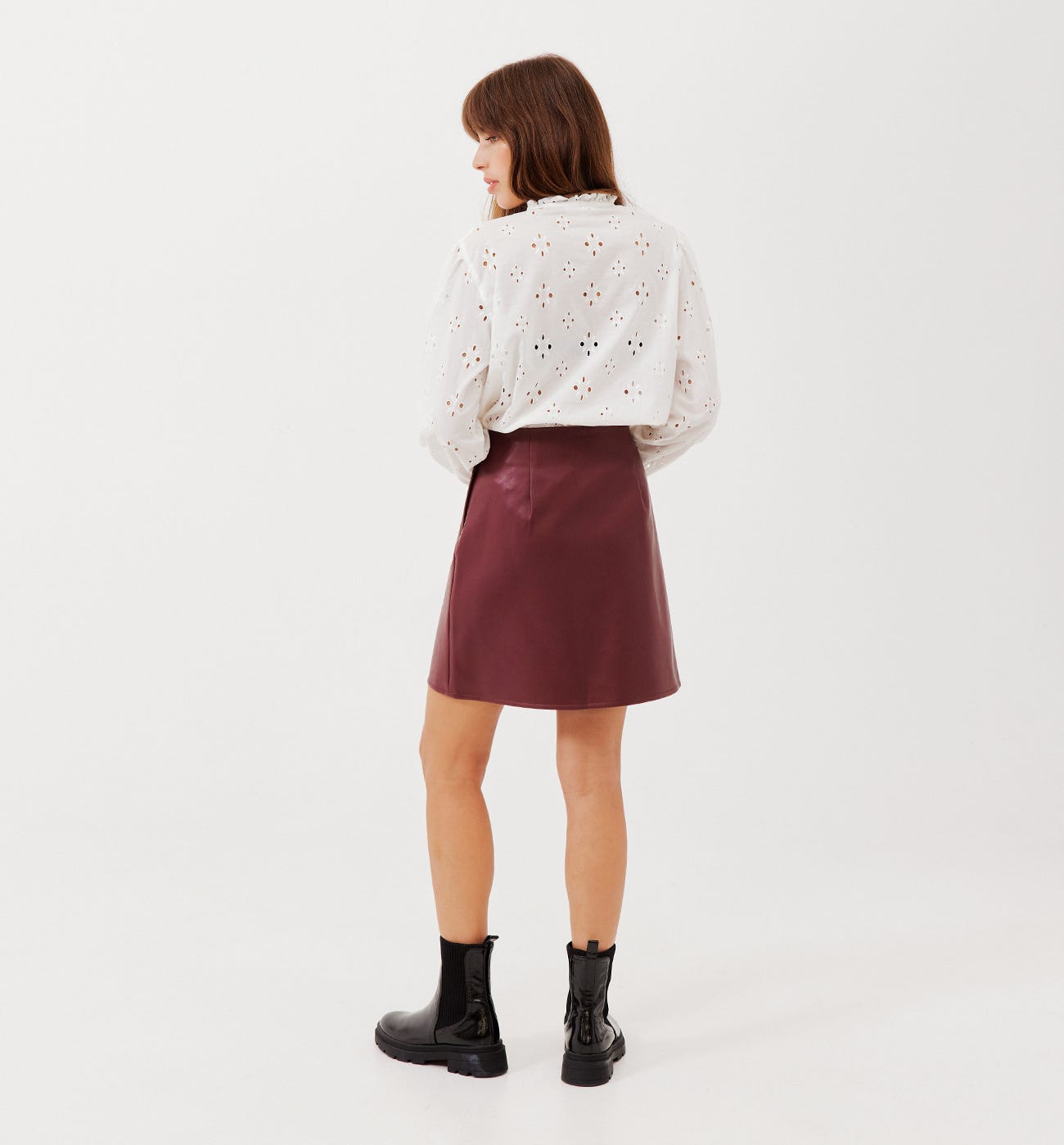 Cette saison, le rock sixties réveille les dressings : démonstration avec cette jupe trapèze effet cuir. En bonus, elle joue sur un faux portefeuille avec un pan boutonné devant. Coupe courte. Ouverture par zip côté. Coutures ton sur ton. Contient des fibres recyclées. Issues de textiles ou de plastiques collectés, les fibres recyclées retournent en filature pour créer de nouveaux vêtements