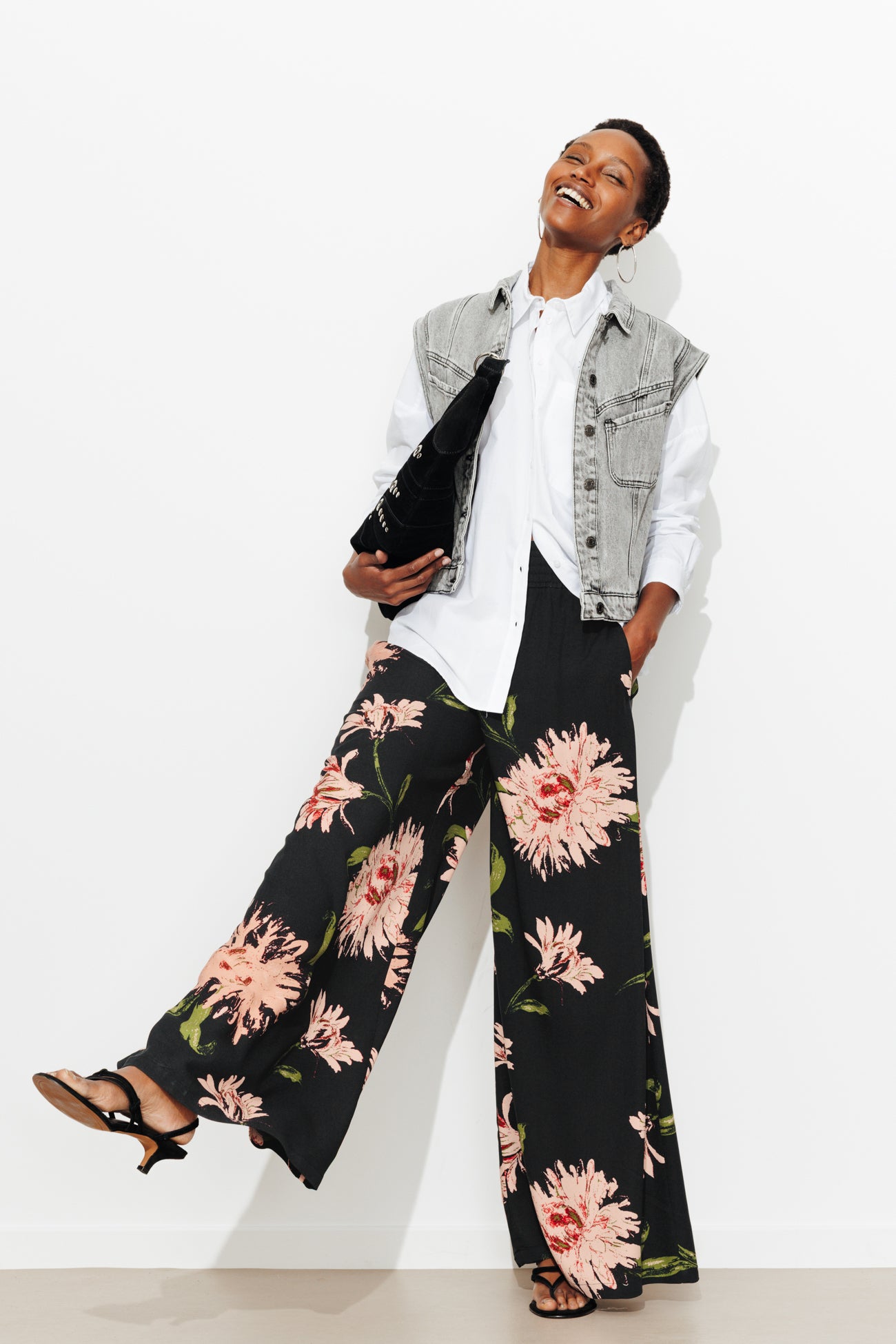 Très large, très fluide. Ce pantalon à fleurs fait sensation dans le paysage de la saison ! On le looke cool avec un simple t-shirt, on l'upgrade avec une veste de tailleur ou un bomber, on l'imagine en vacances avec un top à bretelles ou un bustier. A aimer aussi en mode homewear. Tissu en viscose crêpée. Taille haute smockée-élastiquée. Coupe très large, jambes longues. 2 poches cachées. Finition piquée.