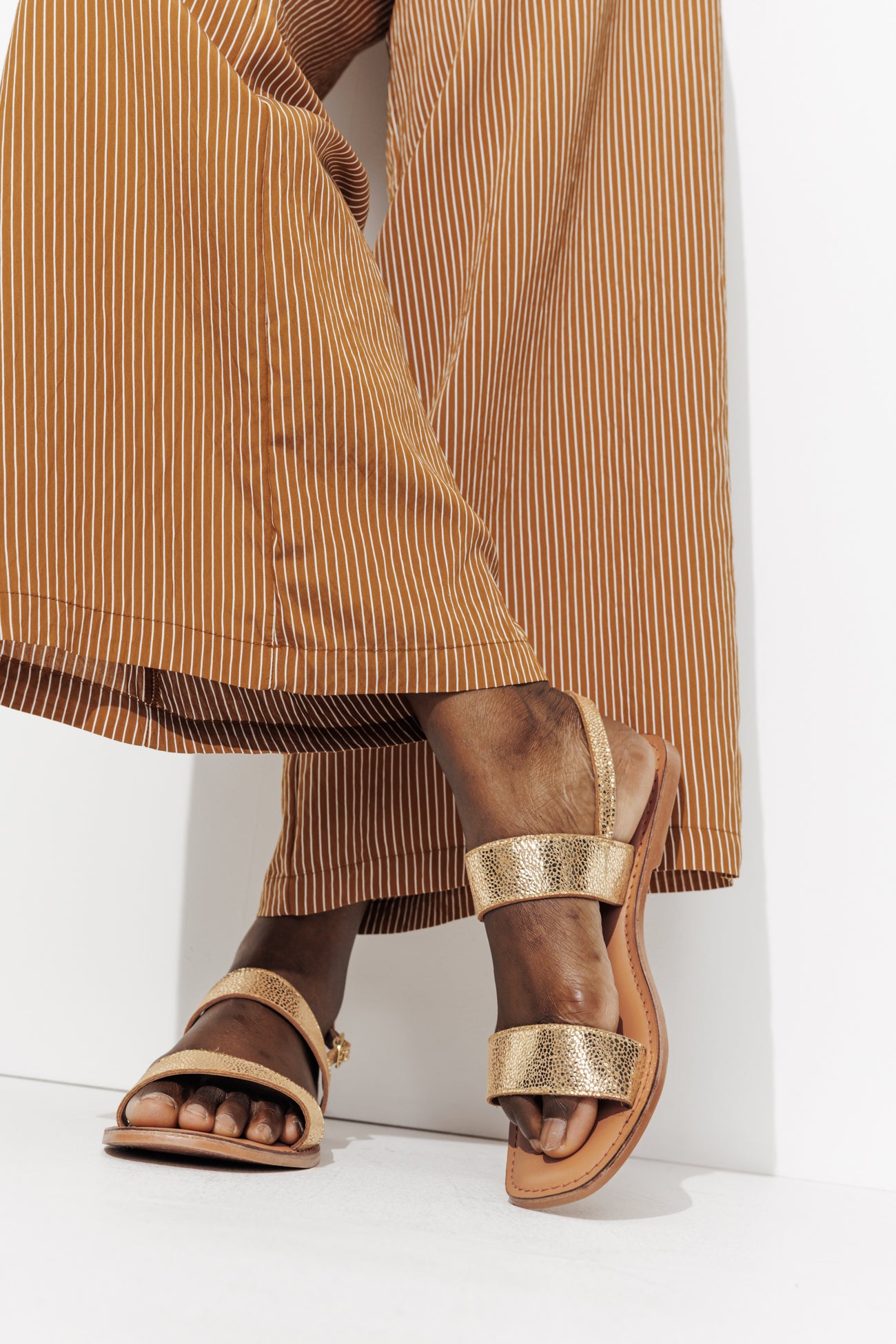 La brillance est à nos pieds : ça donne un éclat particulier aux looks de l'été et ça met en valeur le vernis à ongles ! On se balade tout cool avec ces sandales plates en cuir. Les brides larges jouent sur un effet matière. La bride cheville est ajustable. Semelle intérieure moussée pour plus de confort. Finition piquée. Semelle plate. Existe en plusieurs pointures. Idée-cadeau.
