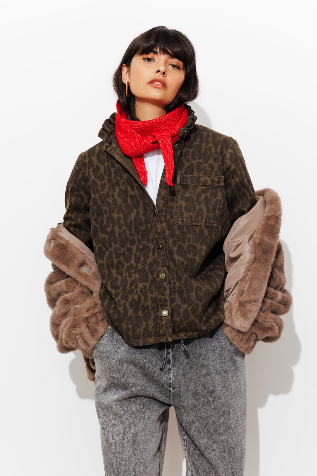Un motif léopard revisité. Un col frou-frou Victorien pour un joli port de tête. On ouvre grand les opportunités de porter cette pièce iconique en version chemise ou surchemise, en fonction de la saison. Toile sergé souple et épaisse, 100% coton. Coupe droite. Col montant volanté. Ouverture par boutons clou. 1 poche poitrine. Manches longues, poignets boutonnés. Base droite. Taille petit.