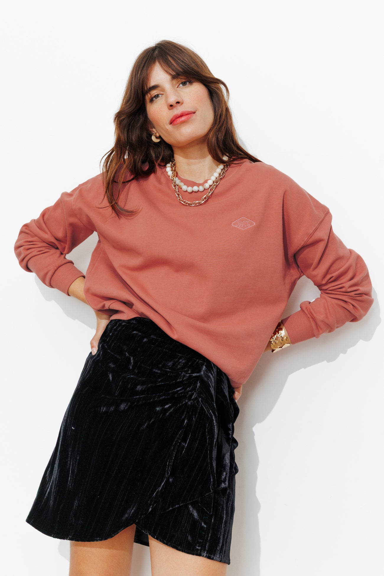 Brodé d'un Sisters Club : on est fans ! La technique de teinture donne un aspect unique et original. La couleur peut déteindre ou se décolorer avec le temps. Molleton doux, intérieur gratté. Coupe courte et large. Col rond. Emmanchures descendues. Manches longues. Base droite. Bords côtelés. Contient du coton issu de l'agriculture biologique, cultivé sans pesticides, ni engrais chimiques, ni OGM.