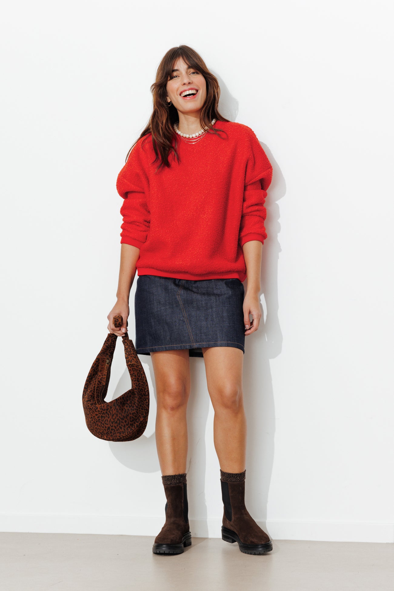 Chaud, tendre et super peps ! On se love vite vite vite dans ce sweat-shirt oversize et uni. Intérieur polaire et extérieur bouclettes. A porter dedans en mode cocoon. A aimer dehors pour prendre l'air frais de l'hiver. A upgrader avec des bijoux ou un foulard imprimé. Coupe ample. Col rond. Emmanchures descendues. Manches longues. Base droite. Bords côtelés. Contient des fibres recyclées.