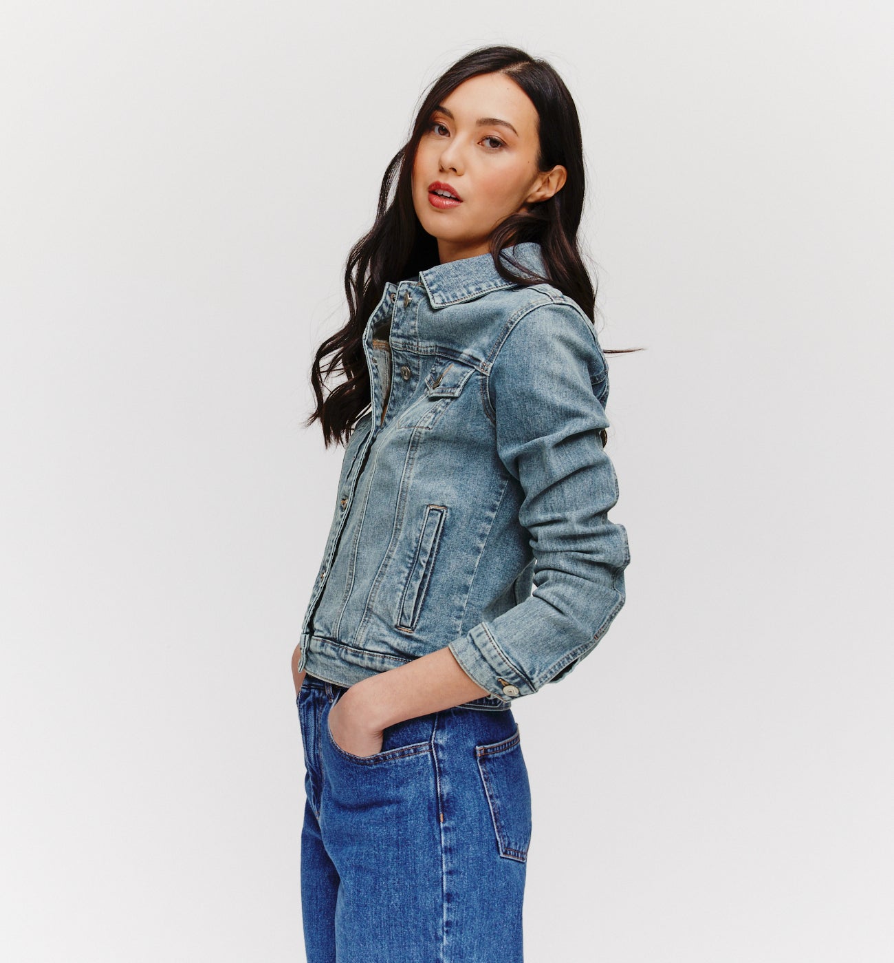 Must-have. Le blouson en jean façon trucker rejoue les 90's, éternellement ! On l'aime en duo avec une robe fleurie. On le porte ouvert ou fermé en total look denim. On le choisit pour décontracter un pantalon de tailleur. Denim légèrement extensible. Coupe ajustée. Col à revers. Ouverture par boutons clou. 4 poches. Manches longues, poignets boutonnés. Cette veste femme contient du coton recyclé.